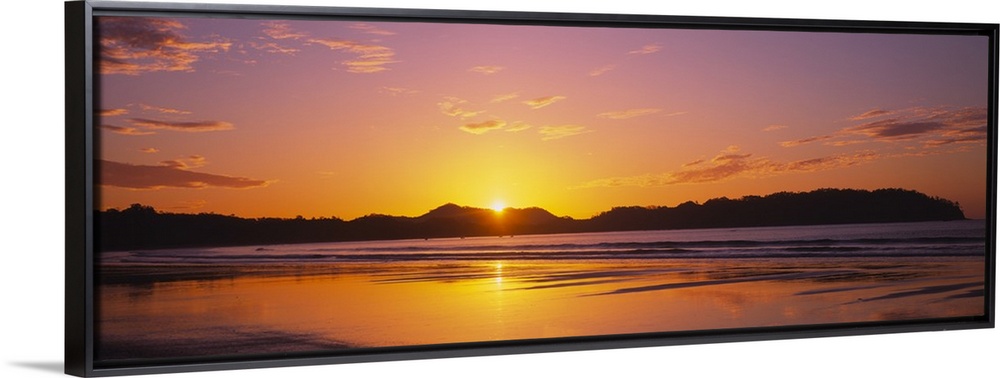<p>Long and horizontal image of the sun rising above a mountain near a beach in Costa Rica.</p>