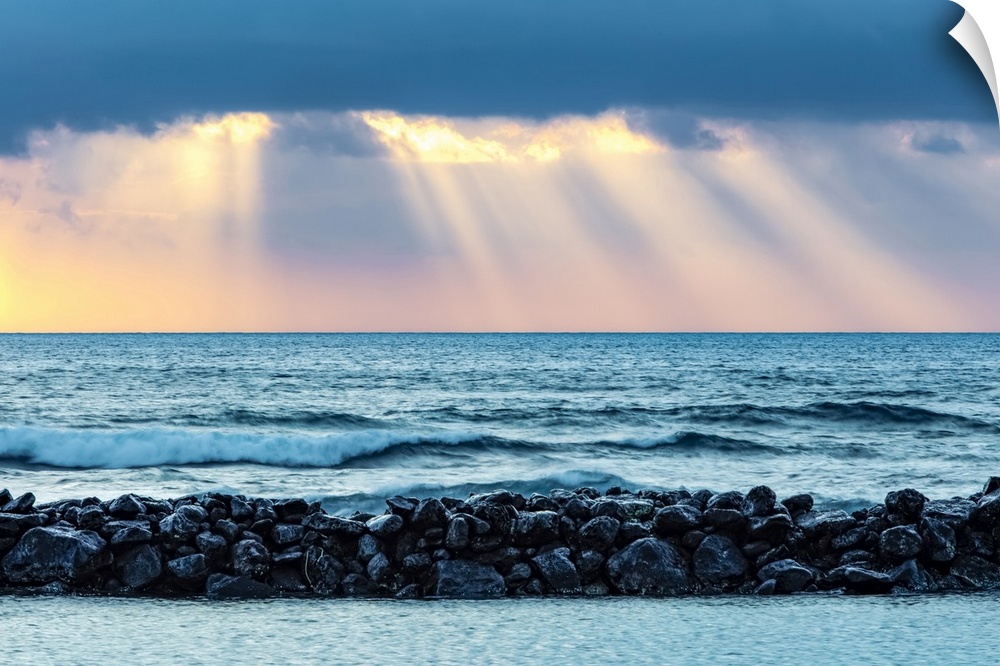 <p>Sunrise over Lydgate Beach and the ocean from the coast of Kauai with a breakwater; Kapaa, Kauai, Hawaii, United States of America</p>
