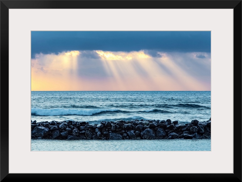 <p>Sunrise over Lydgate Beach and the ocean from the coast of Kauai with a breakwater; Kapaa, Kauai, Hawaii, United States of America</p>