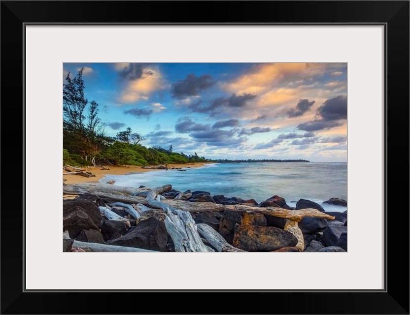 <p>Sunrise over Lydgate beach and ocean with rocks and driftwood in the foreground and the coastline in the distance; Kapaa, Kauai, Hawaii, United States of America</p>
