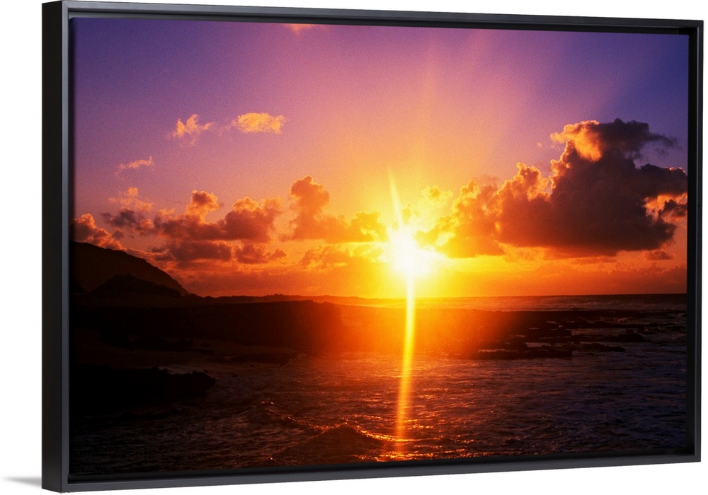 <p>Giant photograph shows a sunrise over Sandy Beach Park in Oahu, Hawaii. The brightness of the sun can be seen glistening over the ocean as it gently crashes into the beach.</p>