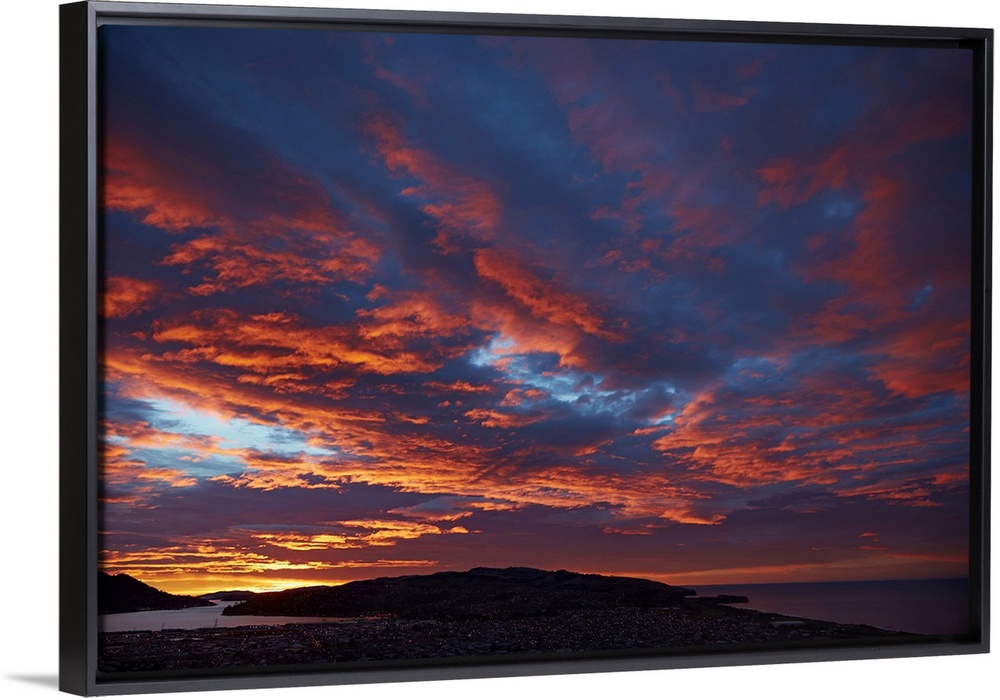 <p>Sunrise over Otago harbor and Pacific Ocean, Dunedin, South Island, New Zealand.</p>
