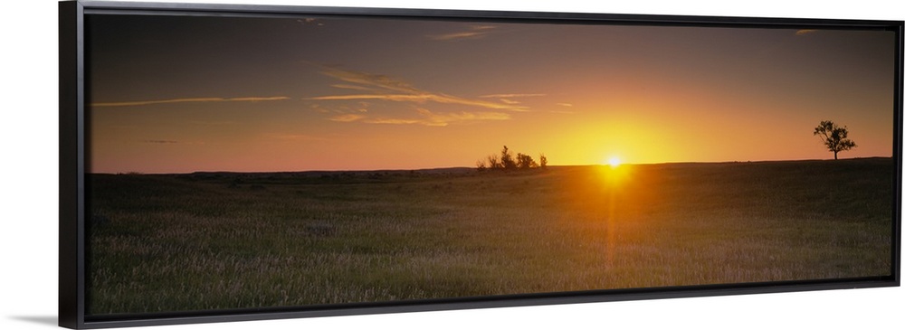 <p>Panoramic picture taken of the sun rising just over the horizon and onto a massive grass plain.</p>
