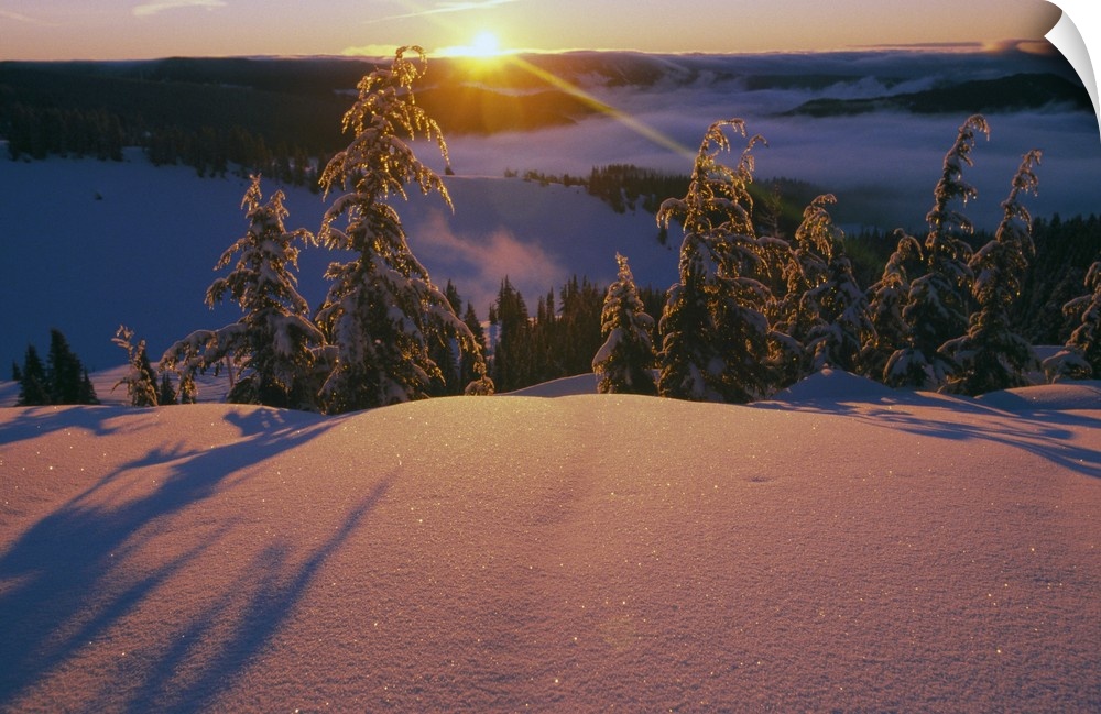 <p>This dramatic landscape photograph captures the sun ascending over the mountain ridge and illuminating the snow covered trees of the opposite ridge and turning the unblemished, powdered snow a warm pastel hue.</p>