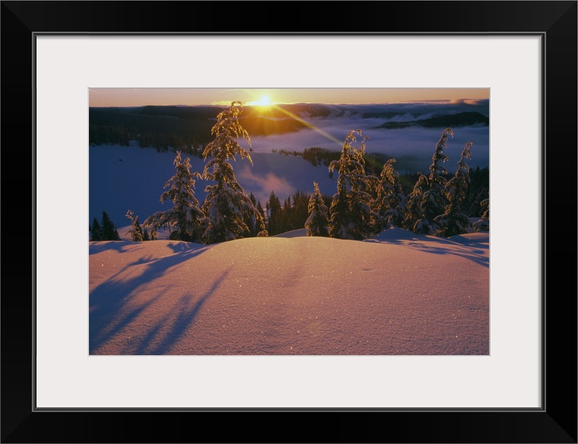 <p>This dramatic landscape photograph captures the sun ascending over the mountain ridge and illuminating the snow covered trees of the opposite ridge and turning the unblemished, powdered snow a warm pastel hue.</p>