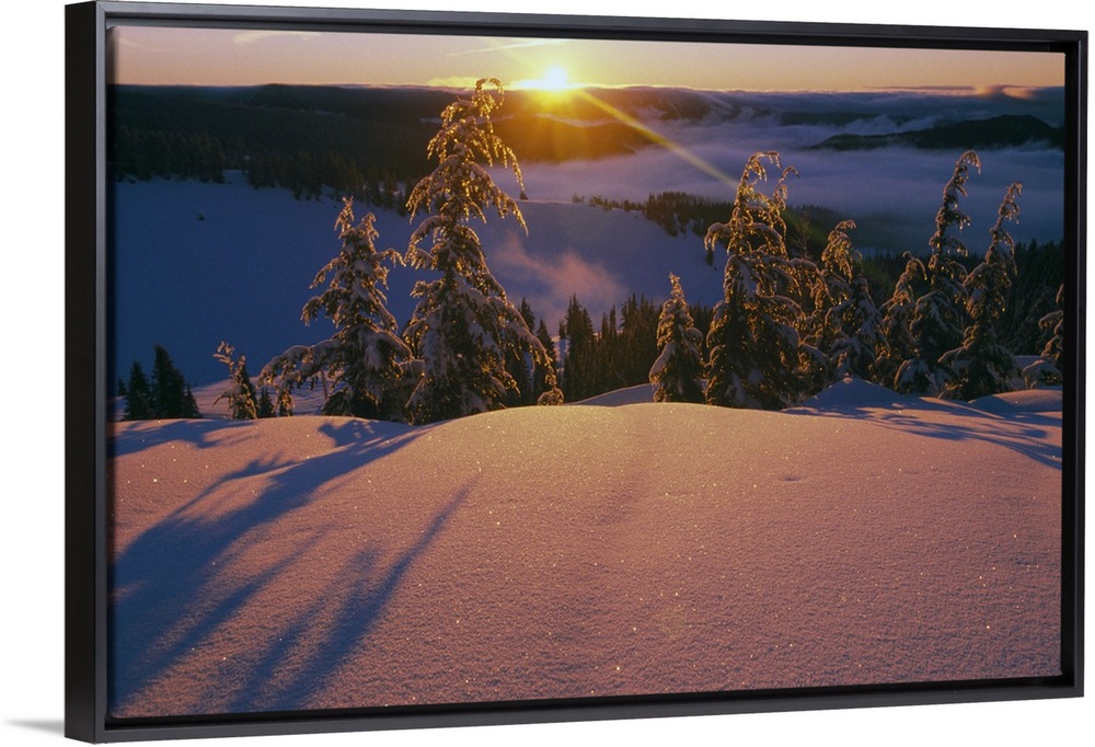 <p>This dramatic landscape photograph captures the sun ascending over the mountain ridge and illuminating the snow covered trees of the opposite ridge and turning the unblemished, powdered snow a warm pastel hue.</p>