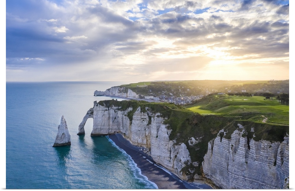 <p>Sunrise over the cliff of Etretat, Octeville sur Mer, Le Havre, Seine Maritime, Normandy, France, Western Europe.</p>