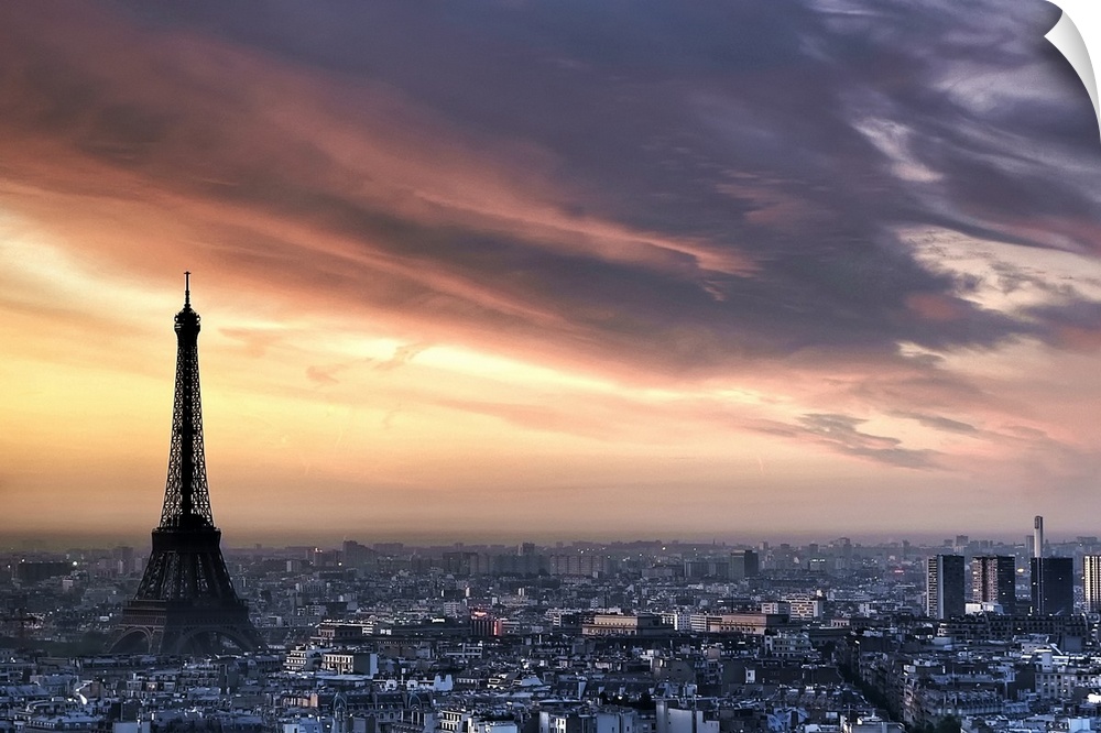 <p>Big, horizontal photograph of the sun rising through wispy clouds as the Eiffel Tower looms over the city of Paris, France.</p>