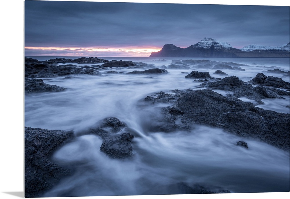 <p>Sunrise over the island of Kalsoy from the basalt ledges at Gjogv on the island of Eysturoy, Faroe Islands.</p>