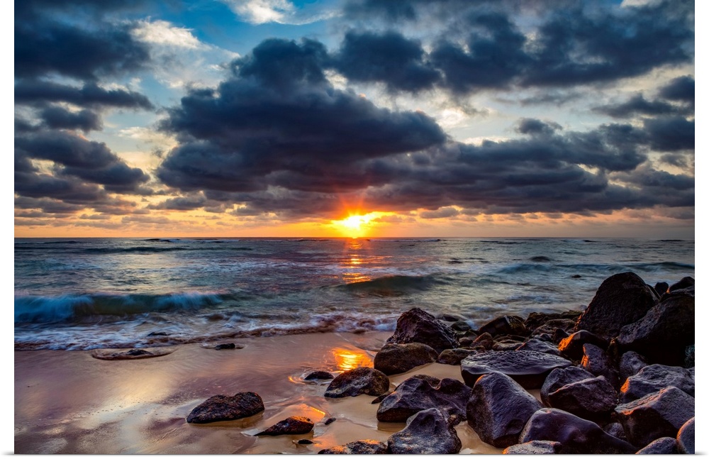 <p>Sunrise over the Pacific Ocean from the rocks on the shore of Lydgate beach and dark clouds overhead. Kapaa, Kauai, Hawaii, united states of America.</p>