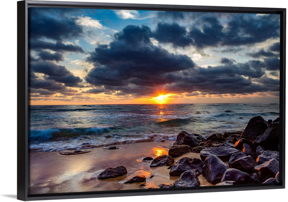 <p>Sunrise over the Pacific Ocean from the rocks on the shore of Lydgate beach and dark clouds overhead. Kapaa, Kauai, Hawaii, united states of America.</p>