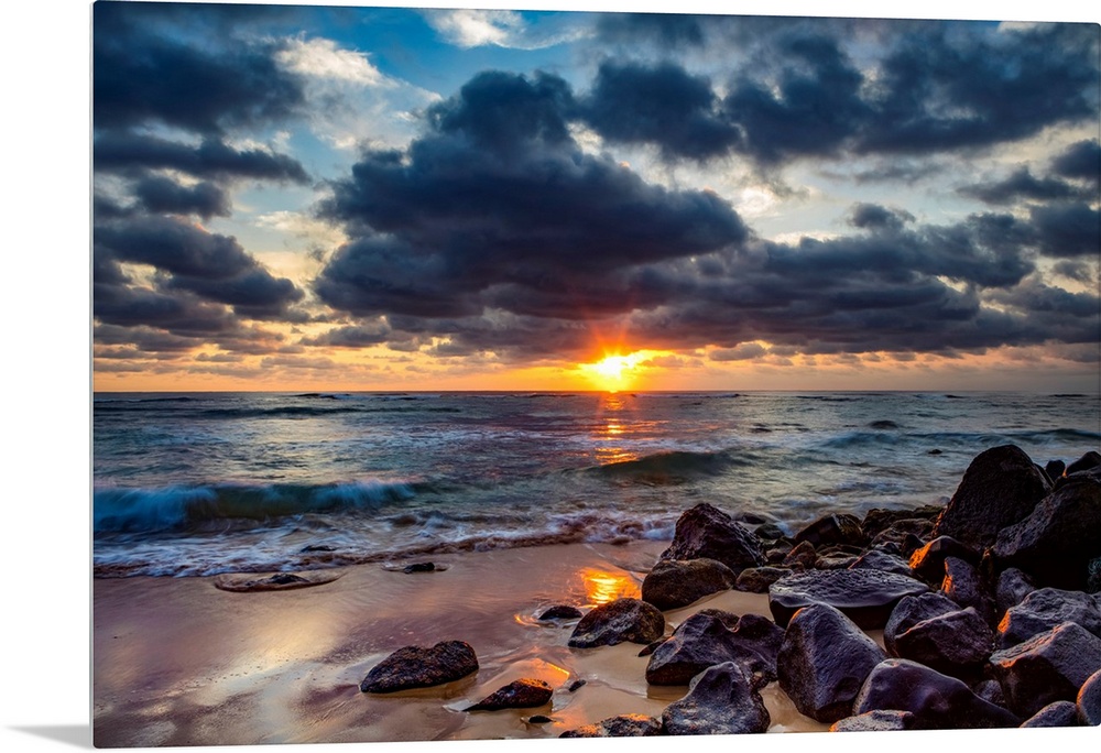 <p>Sunrise over the Pacific Ocean from the rocks on the shore of Lydgate beach and dark clouds overhead. Kapaa, Kauai, Hawaii, united states of America.</p>