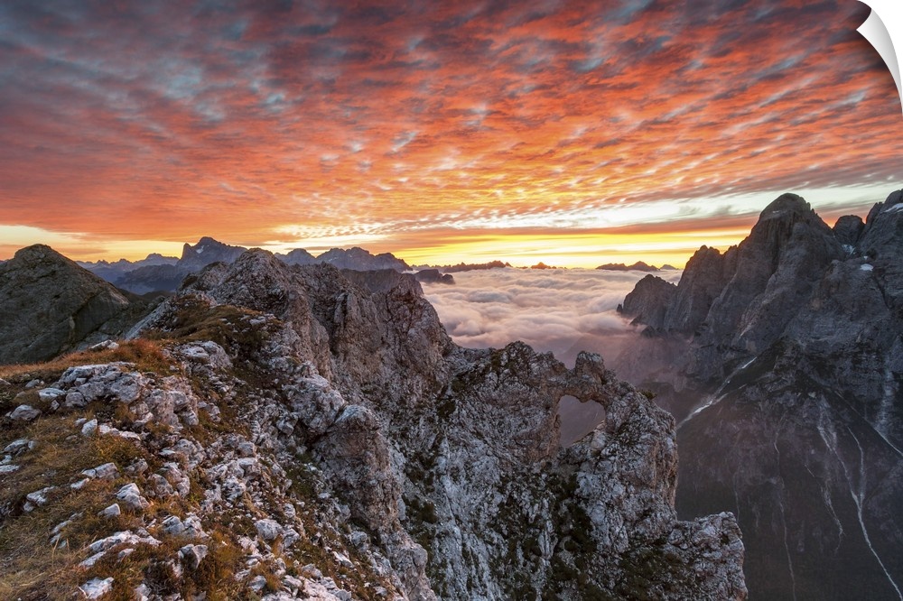 <p>Colorful sunrise over the ridges of the Pale of the Balconies, Pala group, Dolomites, Italy. In the background mount Civetta, mount Moiazza and the sharp edges of Agner. Europe, Italy, Veneto, Agordino, Dolomites.</p>