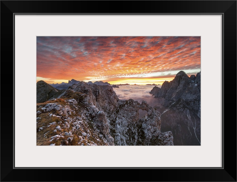 <p>Colorful sunrise over the ridges of the Pale of the Balconies, Pala group, Dolomites, Italy. In the background mount Civetta, mount Moiazza and the sharp edges of Agner. Europe, Italy, Veneto, Agordino, Dolomites.</p>