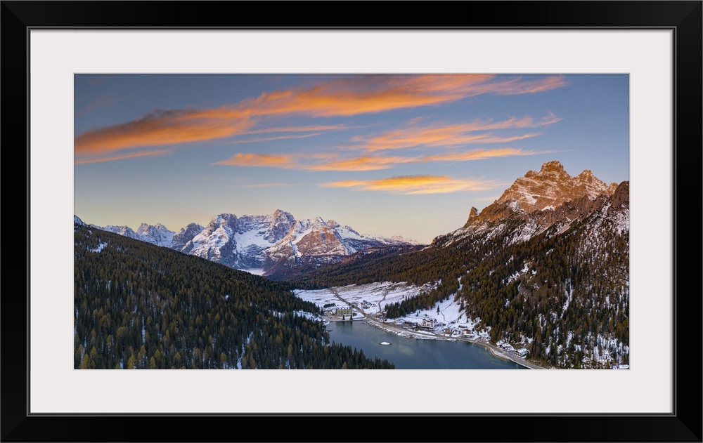 <p>Sunrise over the snowy woods surrounding Lake Misurina and Sorapis, aerial view, Dolomites, Belluno province, Veneto, Italy, Europe</p>