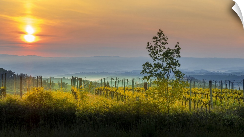 <p>Sunrise over the vineyards of Tuscany. Tuscany, Italy.</p>