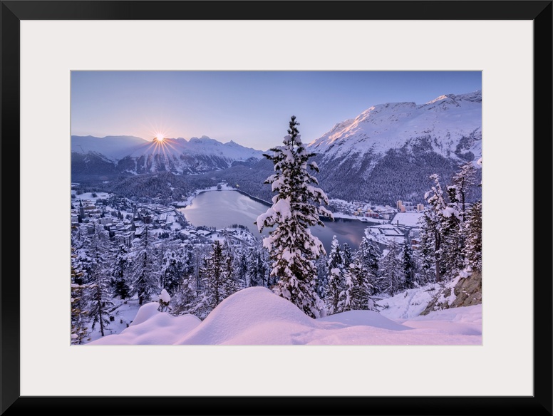 <p>Sunrise over village and Lake of St. Moritz covered with snow, Engadine, Canton of Graubunden, Switzerland, Europe</p>