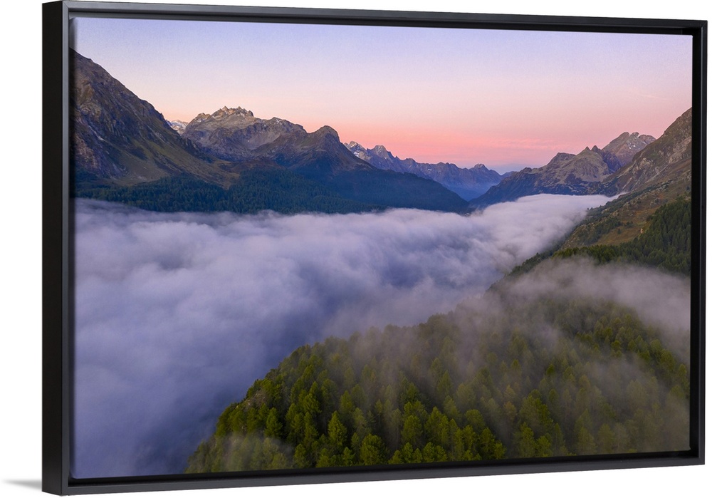 <p>Foggy sunrise over woods of Maloja Pass at dawn, aerial view by drone, Engadine, Canton of Graubunden, Switzerland, Europe</p>