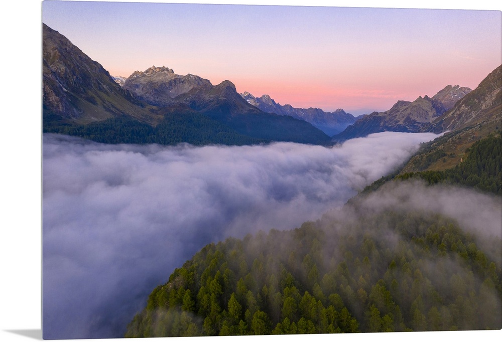 <p>Foggy sunrise over woods of Maloja Pass at dawn, aerial view by drone, Engadine, Canton of Graubunden, Switzerland, Europe</p>