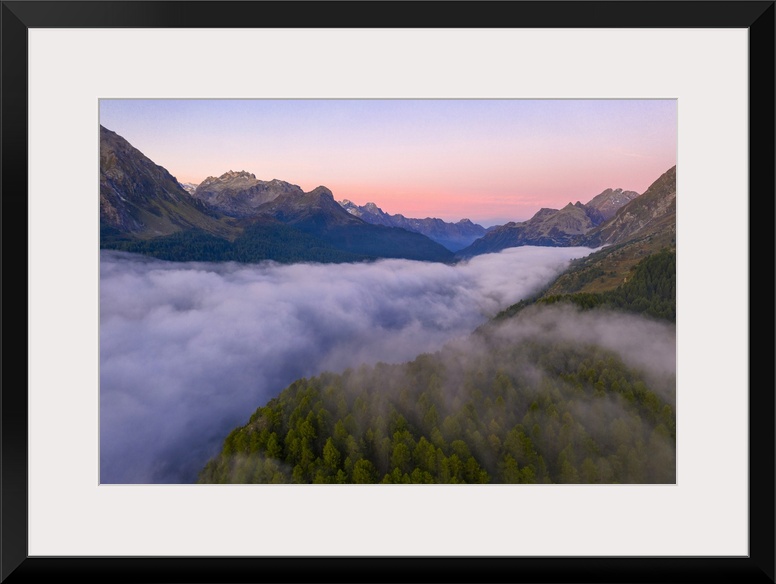 <p>Foggy sunrise over woods of Maloja Pass at dawn, aerial view by drone, Engadine, Canton of Graubunden, Switzerland, Europe</p>