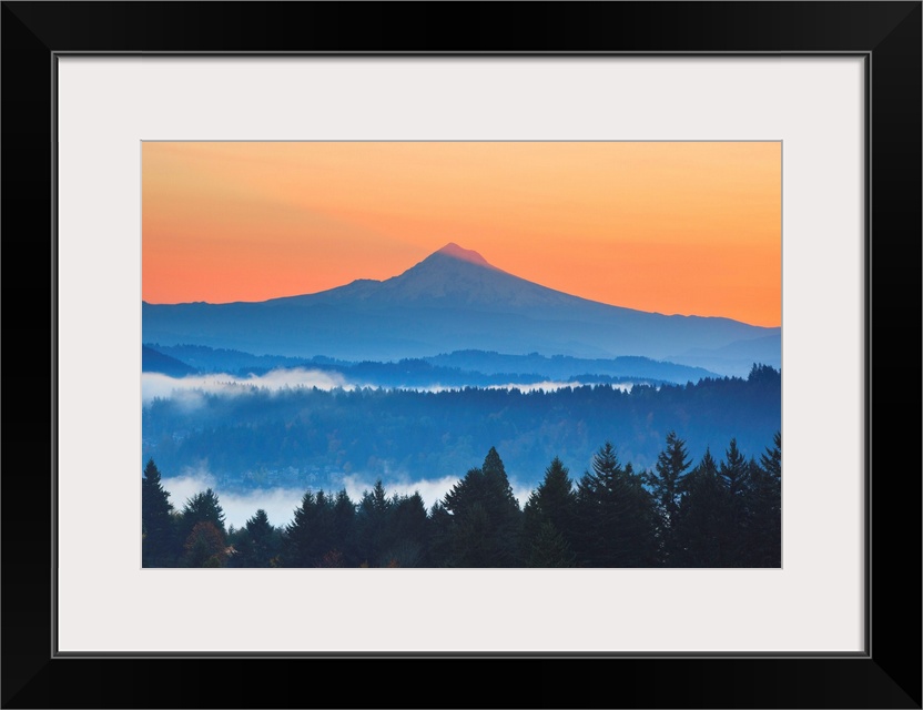 <p>sunrise thru morning fog adds beauty to Mt. Hood from Happy Valley, Oregon, Pacific Northwest.</p>