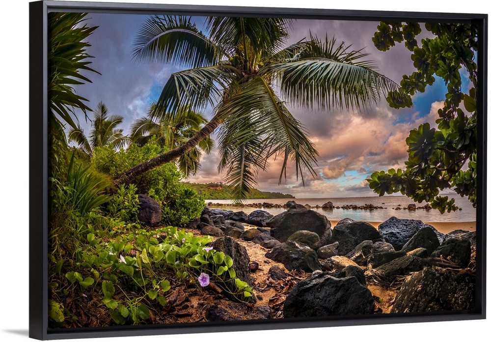 <p>Sunrise under a coconut palm on a calm ocean bay, Kiluea, Hawaii, United States of America, Pacific</p>