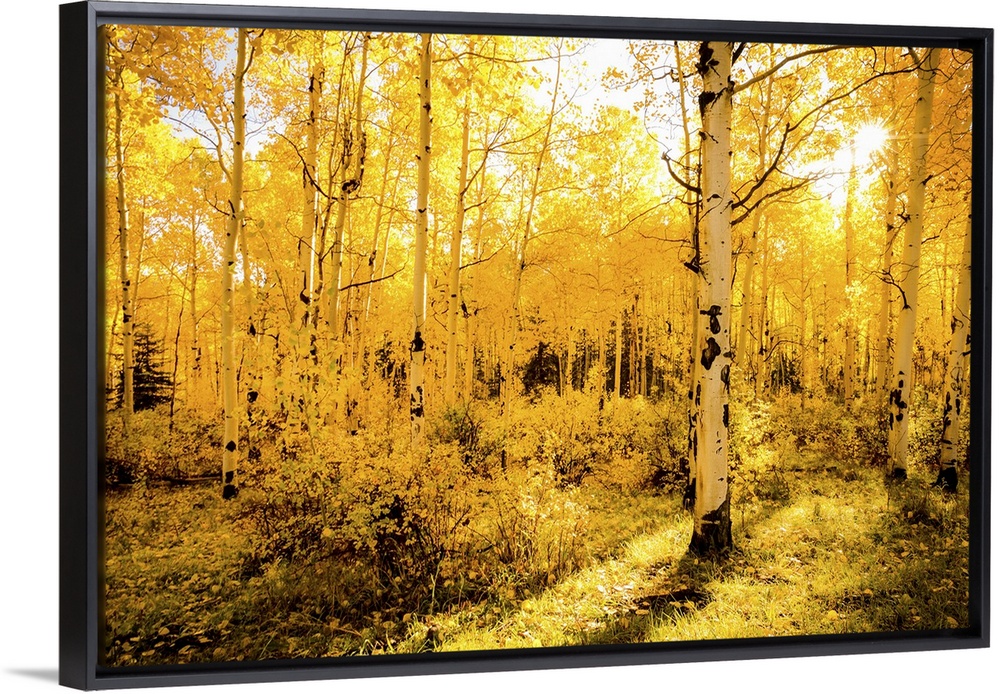 <p>Horizontal canvas of a forest of aspen trees being bathed in the warm sun.</p>