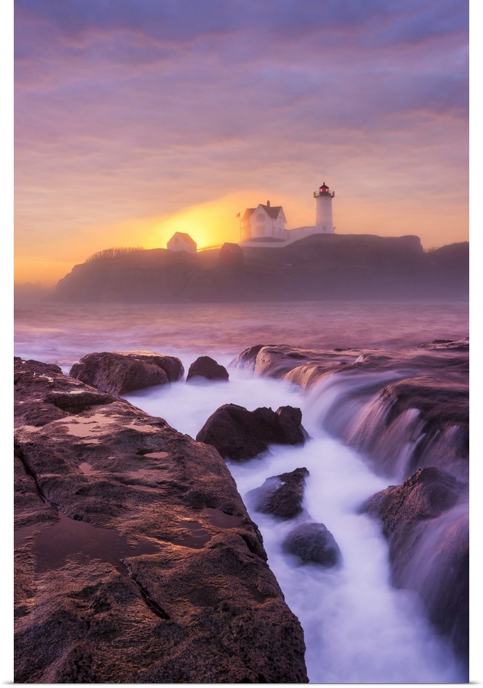 <p>Sunrise with fog at Nubble Lighthouse, Cape Neddick, Maine, USA.</p>