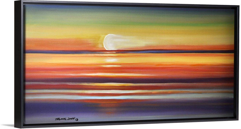 <p>Painting of the sun setting over the calm ocean.</p>