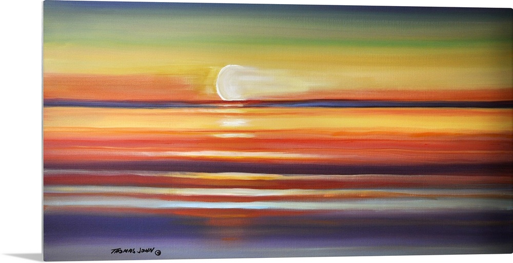 <p>Painting of the sun setting over the calm ocean.</p>