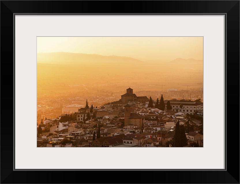 <p>Atmospheric sunset above historic Albaicin and Iglesia de San Cristobal, UNESCO, viewed from San Miguel Alto, Albaicin, Granada, Andalucia, Spain</p>