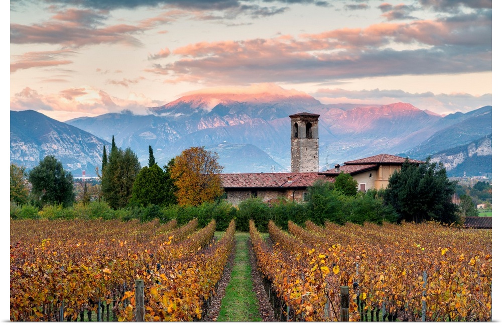 <p>Sunset Among The Vineyards Overlooking Mount Guglielmo, Brescia Province, Lombardy District, Italy.</p>