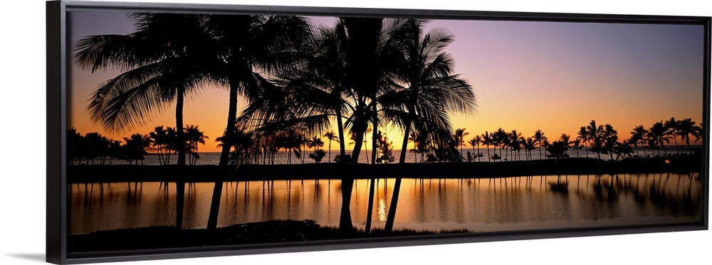 <p>Panoramic photograph taken of a colorful sunset where the silhouette of the palm trees and landscape can be seen reflecting over the water in the foreground.</p>
