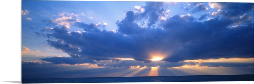 <p>Panoramic photograph of the sun peaking through large, fluffy clouds as it sets over the Gulf of Mexico in Florida.</p>