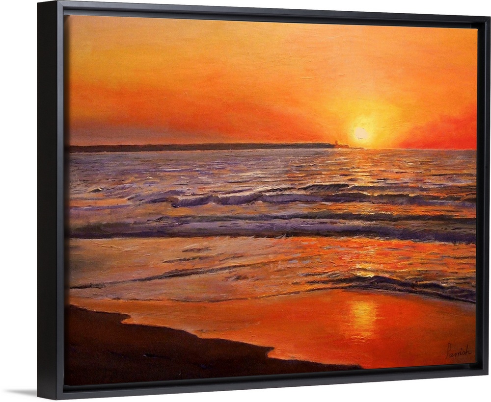 <p>This wall art for the home or office is a contemporary painting of the sun sinking below the horizon as waves enfold the shore.</p>