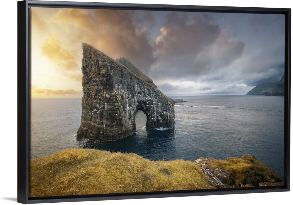 <p>Sunset at Drangarnir, the famous sea stack in Vagar island, Faroe Islands, Denmark, North Atlantic, Europe</p>