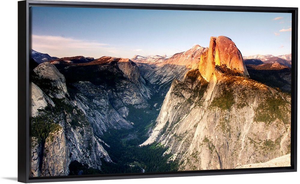 <p>A cloudless sunset at Glacier Point still manages to be beautiful thanks to the dramatic scenery formed by the Tenaya Canyon and the granite cliffs under Half Dome in Yosemite National Park.</p>
