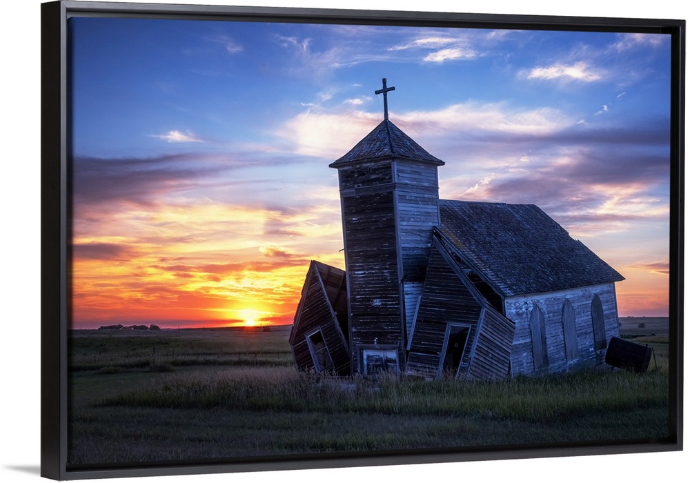 <p>Another day ends with a brilliant sunset at the old St. Johns Lutheran Church in the ghost town of Arena, North Dakota.</p>
