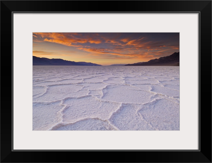 <p>Sunset at the Salt pan polygons, Badwater Basin, 282ft below sea level and the lowest place in North America, Death Valley National Park, California, United States of America, North America</p>