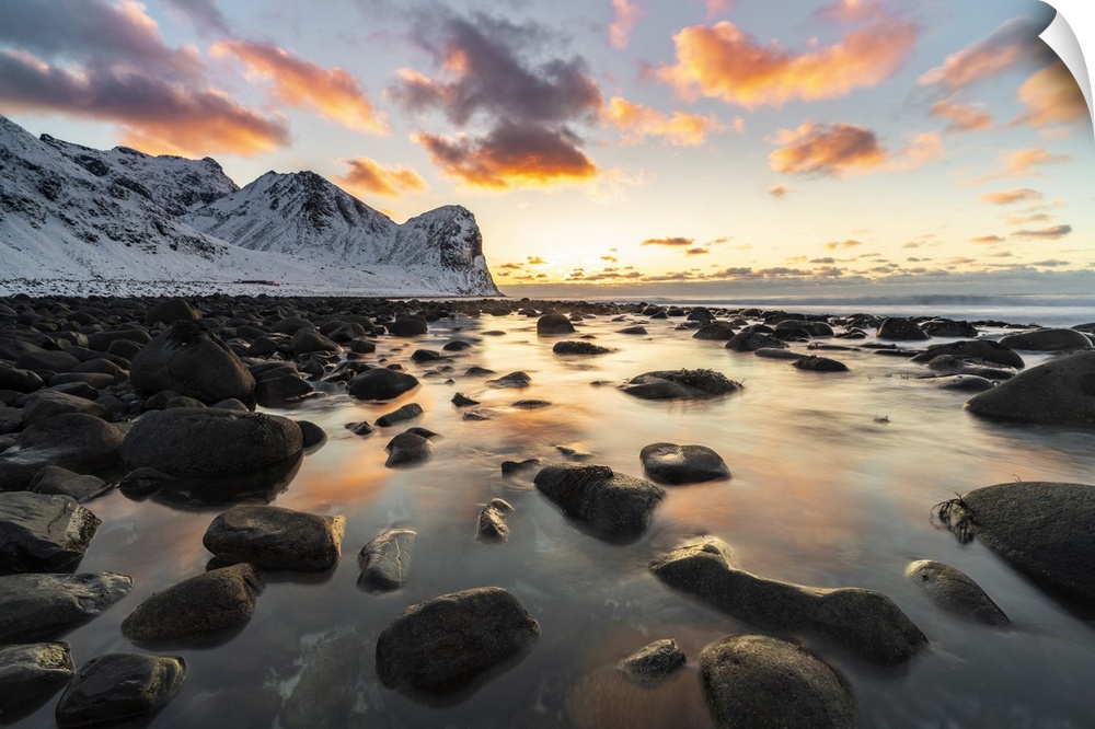 <p>Sunset at Unstad Beach in winter. Vestvagoy municipality, Nordland county, Northern Norway, Norway.</p>