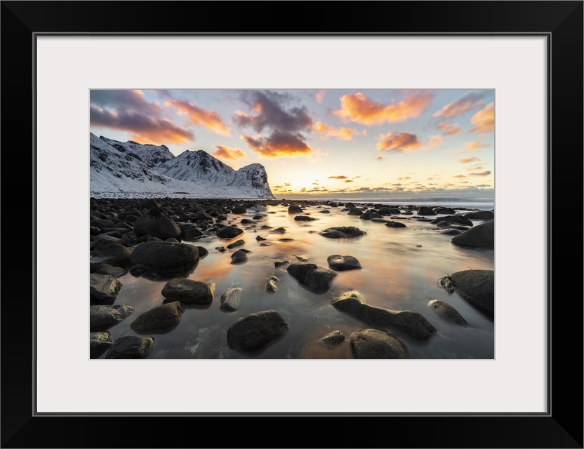 <p>Sunset at Unstad Beach in winter. Vestvagoy municipality, Nordland county, Northern Norway, Norway.</p>