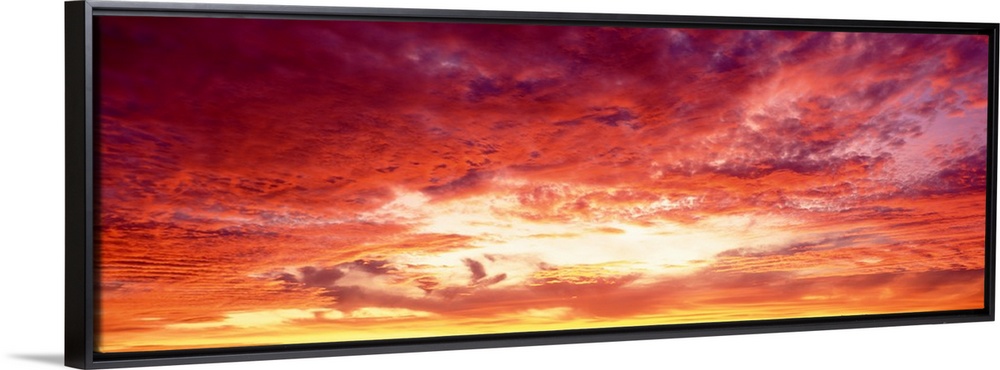 <p>Panoramic photograph of a beautiful sunset sky with warm colored clouds gathered around the sun.</p>