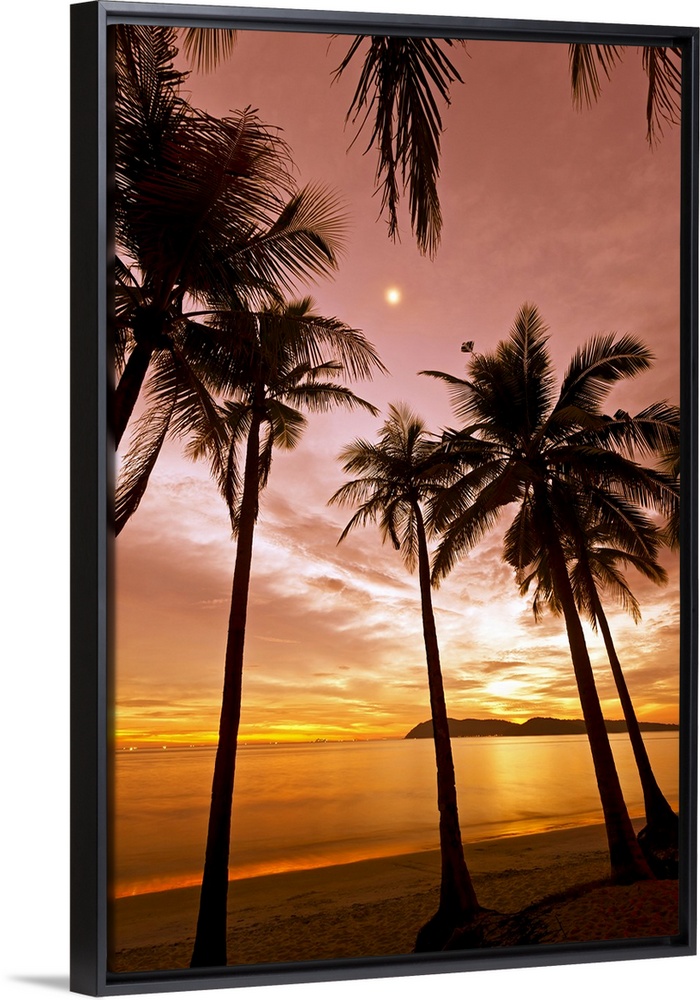 <p>The silhouetted of palm trees on a beach arch into the sky at sunset reaching towards the moon which is obscured by clouds in the pastel colored sky.</p>