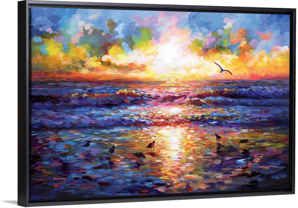 <p>A radiant sunset spreads across the horizon, filling the sky and ocean with glowing shades of gold, pink, and violet. Waves move gently toward the shore while seabirds walk along the shimmering reflections in the wet sand. A lone bird soars above the glowing horizon, adding a sense of freedom and peace. This vibrant scene captures the magic of the seaside at dusk, bringing warmth, beauty, and serenity to any space.</p>