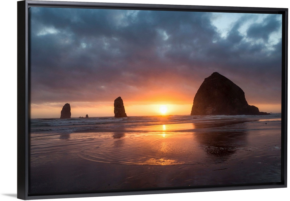<p>Sunset behind Haystack Rock at Cannon Beach on the Pacific Northwest coast, Oregon</p>