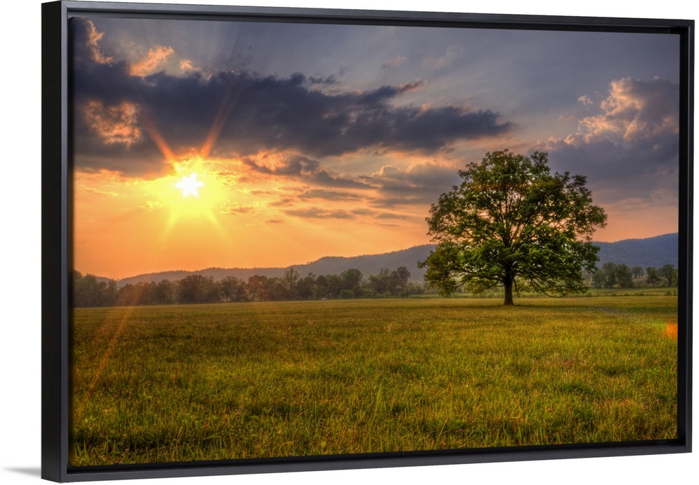 <p>Oversized, landscape photograph of a bright sunset over a vast field, with a single tree in the foreground and mountains on the distant horizon, in Great Smoky Mountains National Park.</p>