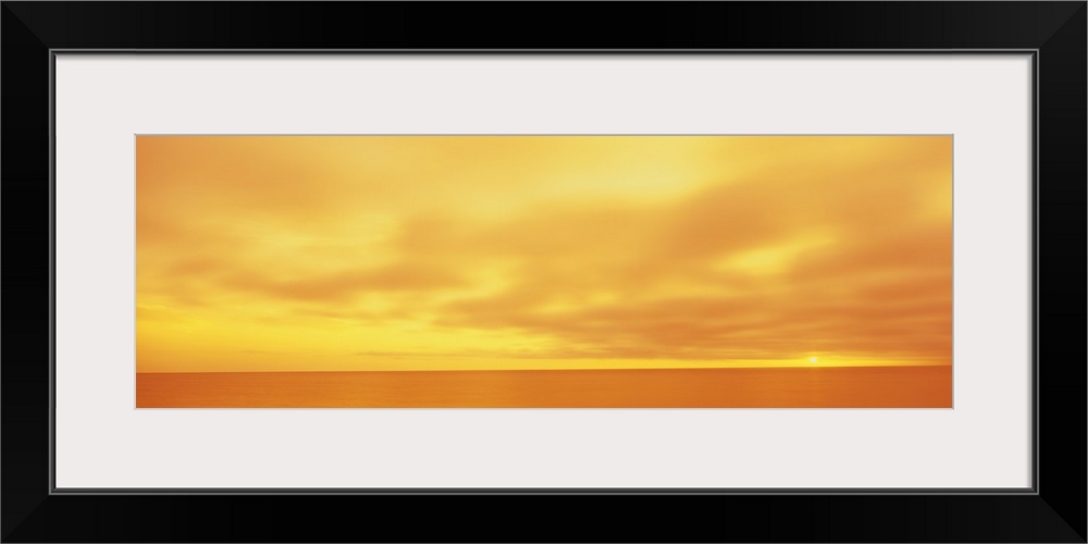 <p>Panoramic photograph of calm wave less ocean under a cloudy sky.</p>