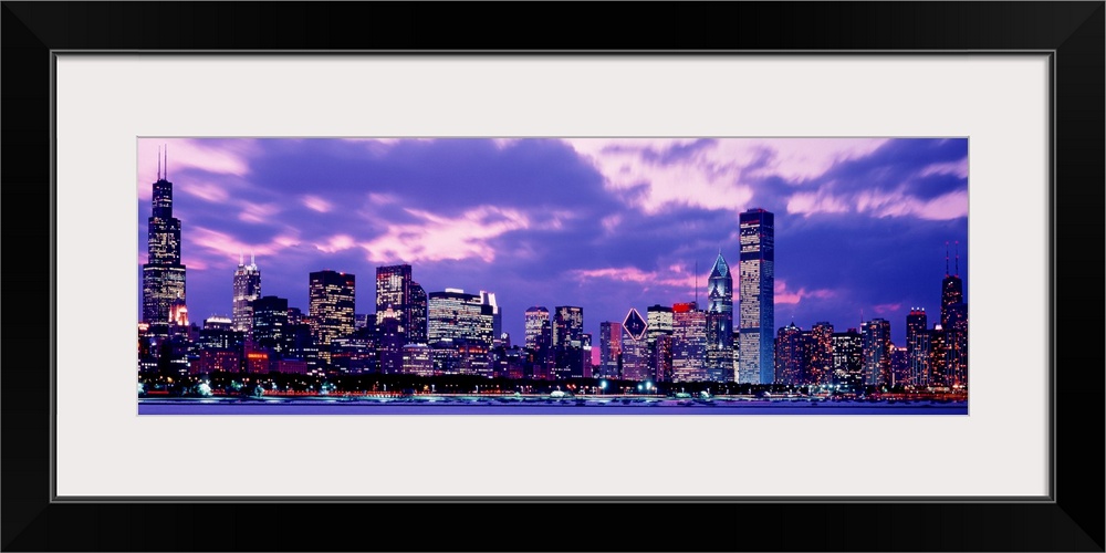 <p>A panoramic landscape photograph taken from on Lake Michigan of the city skyscrapers.</p>