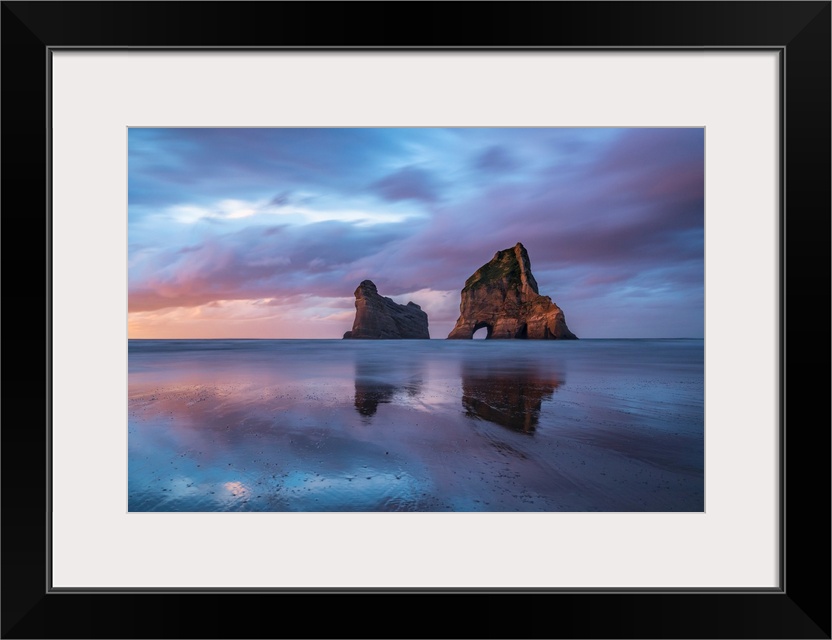 <p>Sunset clouds above Archway Islands. Wharariki beach, Puponga, Tasman district, South Island, New Zealand.</p>
