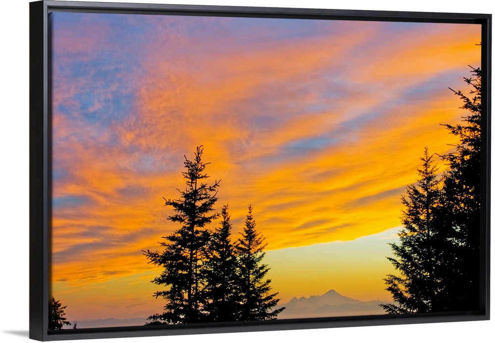 <p>Sunset clouds blaze orange over Iliamna Volcano (elev. 10,016 feet) in Lake Clark National Park, as seen from the hills near Nikolaevsk across Cook Inlet from the Kenai Peninsula in southcentral Alaska.</p>
